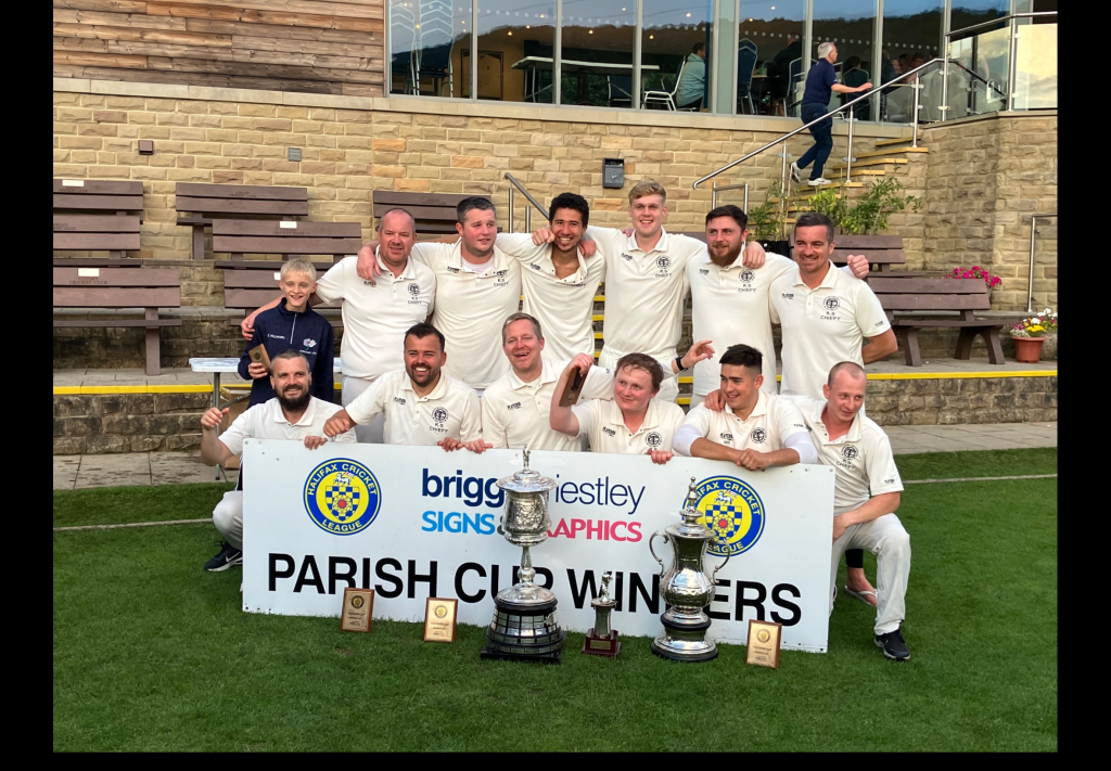 - In 2023 they finished top of the division, out of 12 teams, 35 points ahead of the 2nd team in the Premier Division, unbeaten that year, and have also won the T20 Cup and the Parish Cup. This is the first time any team has won the treble. In 2022 they ended 5th in the Premier League. In August 2024 they beat Illingworth St. Mary’s CC by 7 wickets in the Parish Cup Final. See photo below. (photo copyright © of Halifax Cricket League.