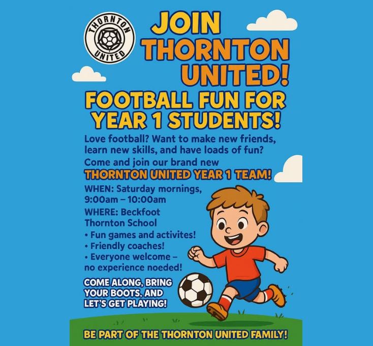 Thornton United Junior Football Club They play in the Craven, Aire and Wharfe Junior League, and their home ground is at St. John’s School, Bradford Road, Clayton, BD14 6DD. In the last 2023/24 season. there were teams, of the following age ranges, playing in many of the divisions of the Craven, Aire and Wharfe Junior League, Thornton United Under 18, U15, U14, U13, U12, U11, U10, U9, U8, and U7. For club contacts see their Facebook page. (Updated 29 July 2024)