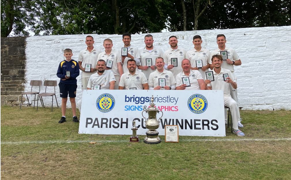 - In 2023 they finished top of the division, out of 12 teams, 35 points ahead of the 2nd team in the Premier Division, unbeaten that year, and have also won the T20 Cup and the Parish Cup. This is the first time any team has won the treble. In 2022 they ended 5th in the Premier League. In August 2024 they beat Illingworth St. Mary’s CC by 7 wickets in the Parish Cup Final. See photo below. (photo copyright © of Halifax Cricket League.