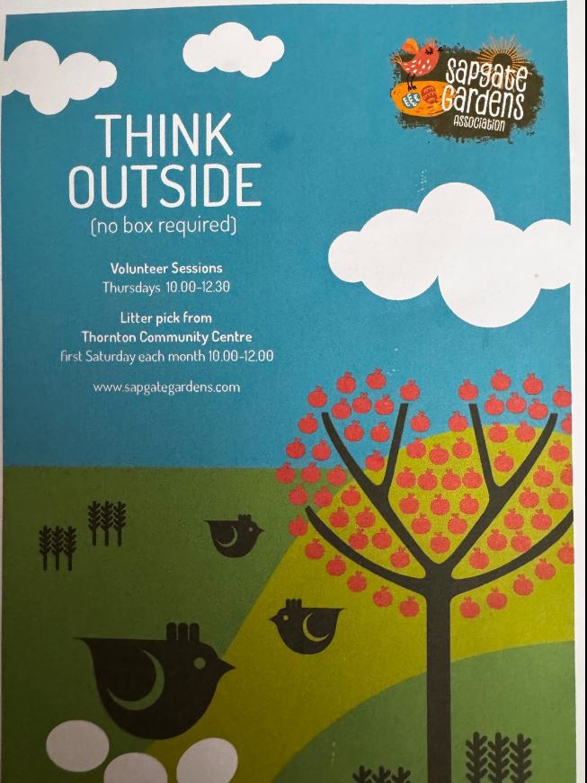 Sapgate Gardens Association was set up after local residents in Thornton came together to create a community garden. They also have a Facebook page. Their events will be included in the Diary of events. (updated 21 July 2025 – illustration added)