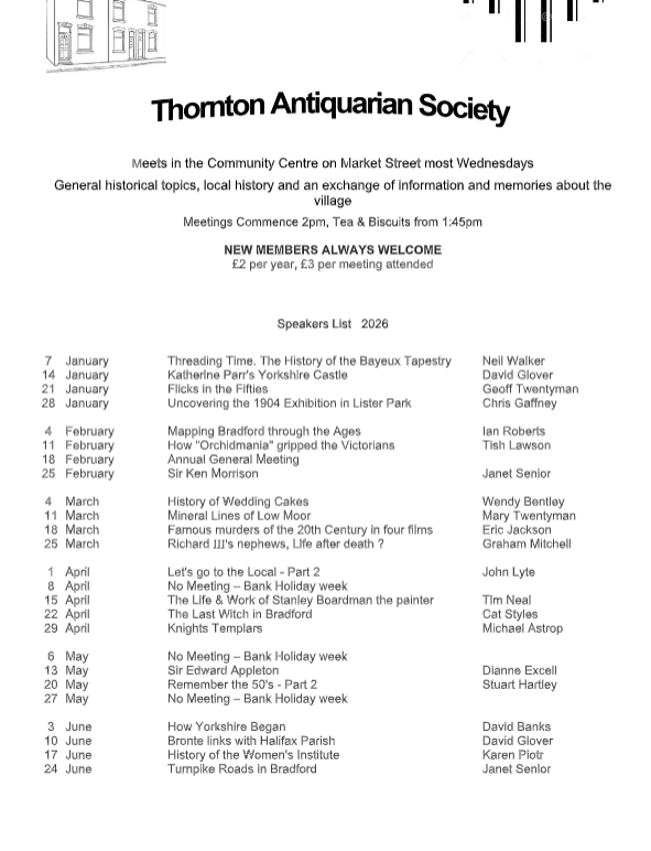 - Holds meetings, normally with speakers, on Wednesdays throughout the year at 2pm, normally at Thornton Community Centre, Market Street. All are welcome. The list of speakers up to July 2025 is on the Diary of Events, and is shown here: