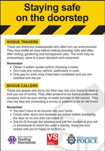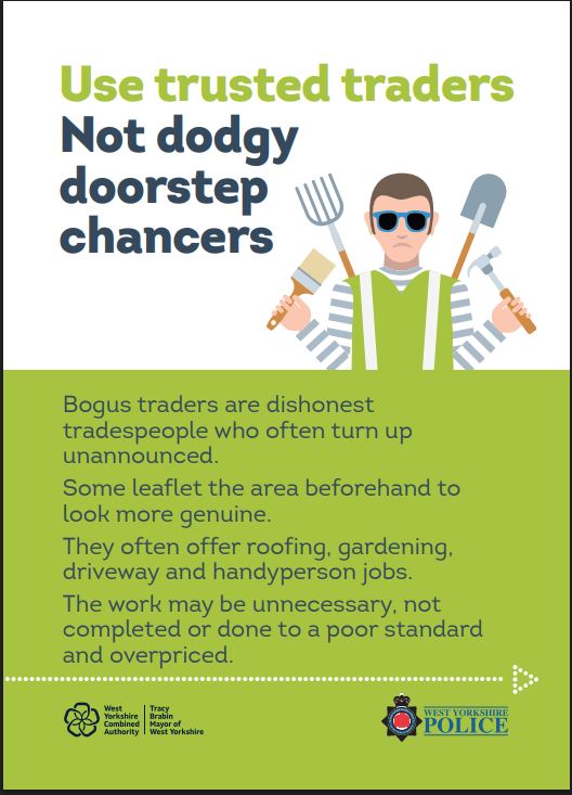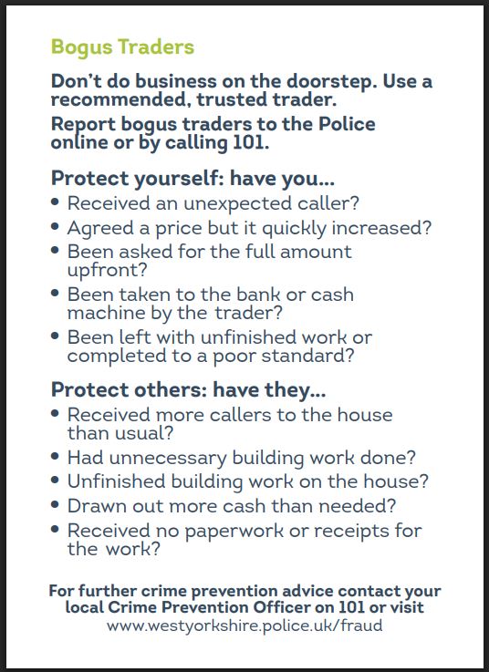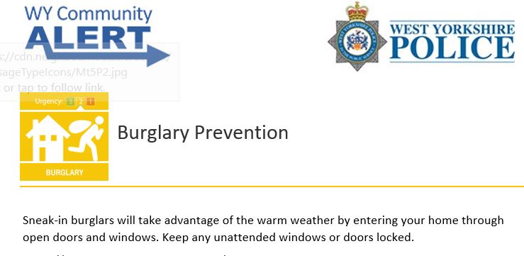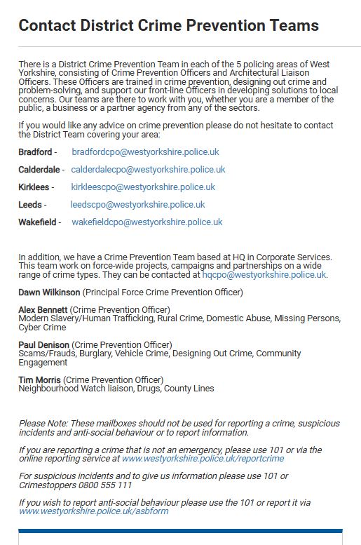 Alerts are from West Yorkshire Police’s Neighbourhood Alert emails, and from the Action Fraud website – run by the City of London Police. All links to relevant websites are in dark green and underlined.