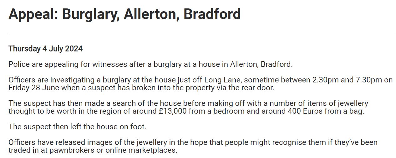 July 17, 2024: In Old Road, Thornton. A note from Neighbourhood Alerts, from WY Police. “Overnight on the 15th July to the 16th July, Suspect(s) unknown have removed the panels to a wooden garage door believed to gain entry to steal, nothing of value inside nothing taken”