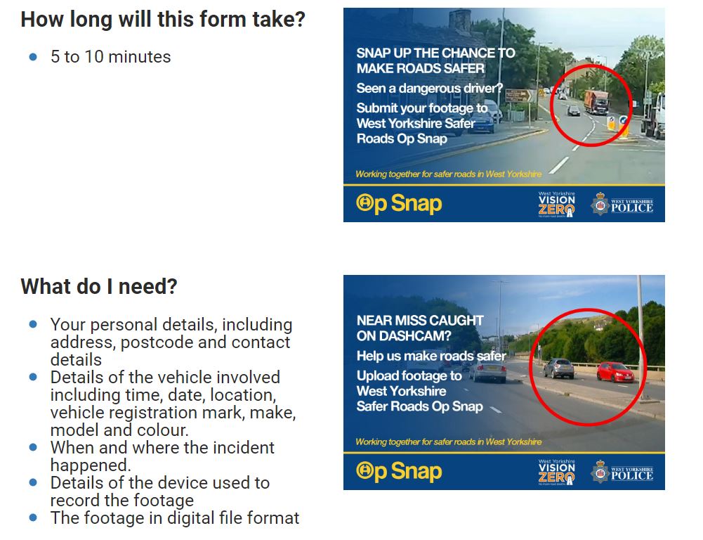 Dash cam footage of dangerous driving Operation Snap. Have you got dash cam footage of dangerous driving on the roads of West Yorkshire? You can now submit it to West Yorkshire Police’s portal: https://www.westyorkshire.police.uk/SaferRoadsSubmissions