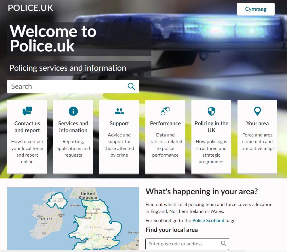 - go to https://www.police.uk/ , you will come to a screen looking like the illustration, and in the box “Find your local area” on your device, enter your postcode, then enter.