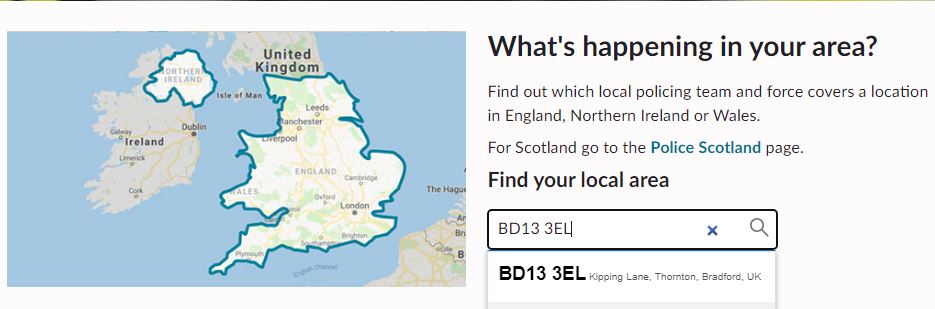 An example is shown in the next illustration: BD3 3EL is Kipping Lane, when entered in the “Find Your Local Area” box, the road is shown.