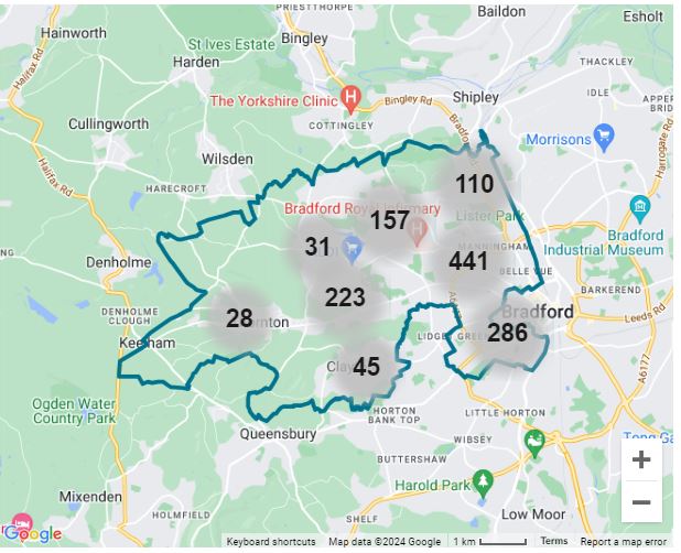 Choose that and the box changes to the road name, and then the screen changes to an illustration of Bradford West Police Division, with total numbers of crimes at the main locations, as shown in the screen-print.