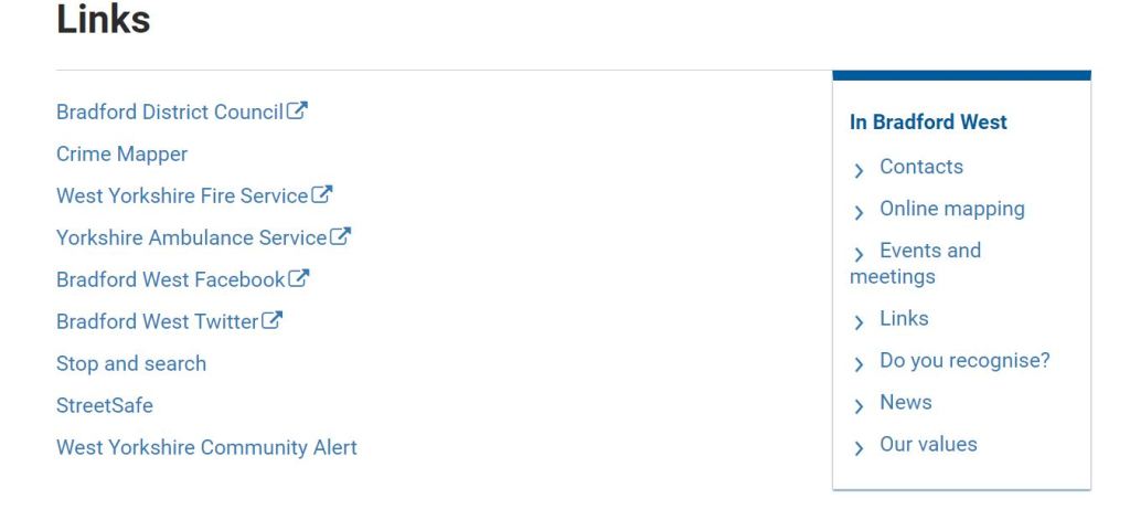 The Neighbourhood Policing team for our area have their own page with links to other pages, including details of contacting the team, crime mapping, meetings they are attending, links, as shown. Below is screen print of the Links page. You need to go to it, to then choose the appropriate links. They also have a Facebook page, promoting different aspects of crime.