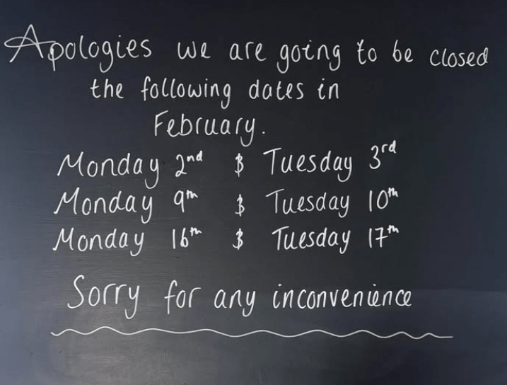 The White Horse Inn closed today and tomorrow, and some earlier dates, for getting things done and staff holidays. See poster