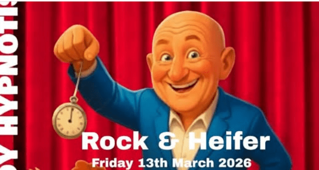 7pm Comedy Hypnotist at the Rock and Heifer. £10. They write: “pm or call in to book. £10 a ticket.”