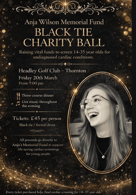 7pm at the Headley Venue Black Tie / Formal dress Charity Ball raising funds to screen 14-35 year olds for undiagnosed cardiac conditions. The organisers write: “In loving memory of Anja. An evening of elegance, music and purpose – all in support of life-saving cardiac screenings for young people. Please message Anja Wilson Memorial – Supporting CRY directly for bookings & enquiries”