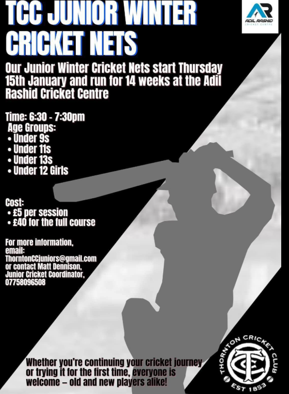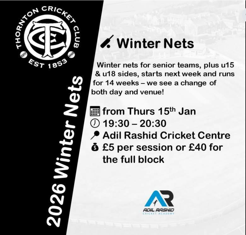 7.30pm to 8.30pm Winter nets arranged by Thornton Cricket Club at the Adil Rashid Cricket centre, Thornton