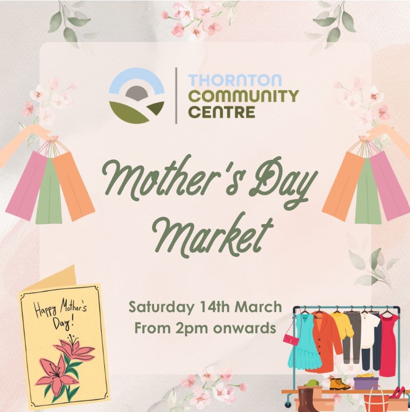 2pm Mothers’ Day Gift Market at Thornton Community Centre – see poster