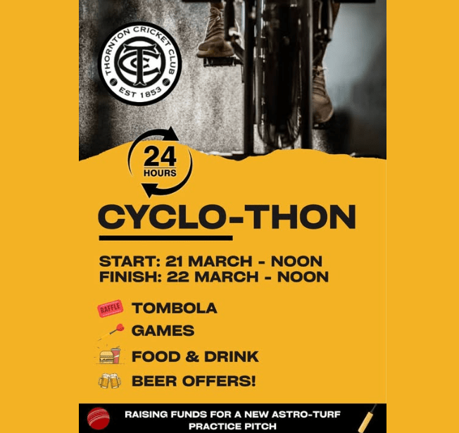 12noon until 12noon on 22nd March Thornton Cricket Club’s senior and junior players will be keeping TWO bikes going for a full 24 hours. They are taking on this challenge to help raise funds for our brand-new astro-turf cricket pitch. #TCC#OneClub#24HourChallenge ,Fundraising link: https://justgiving.com/crowdfunding/tcc-cyclothon