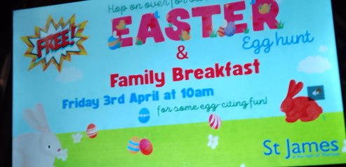 10am at St. James Church. Easter Egg hunt and Family Breakfast – see poster.