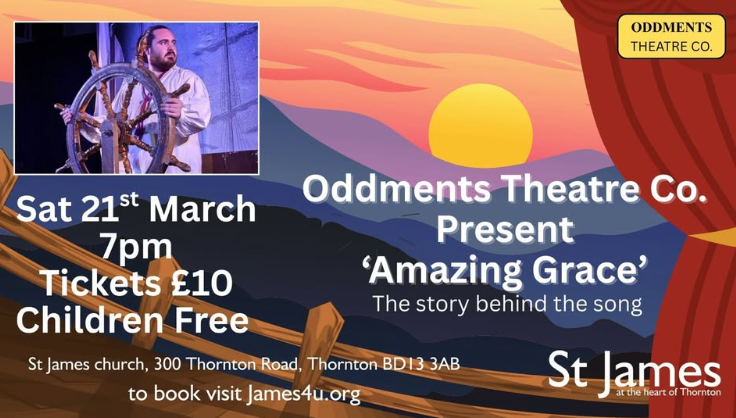 7pm Oddments Theatre Company present “Amazing Grace”, the story behind the song, at St James Church. Book here https://tickets.myiknowchurch.co.uk/gb/NDYwLTcy/t