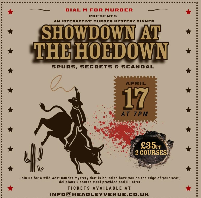 7pm at the Headley Venue, Dial M for Murder presents an interactive Murder Mystery Dinner – see poster