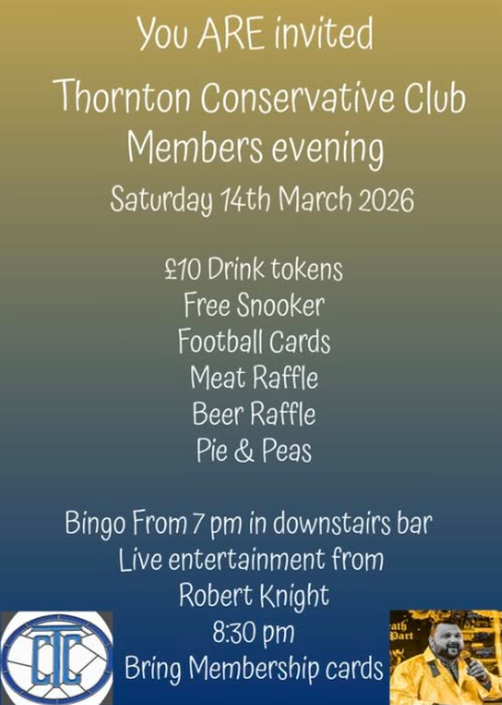 7pm onwards MEMBERS ONLY (Bring membership cards) Thornton Conservative Club Members Evening – see poster