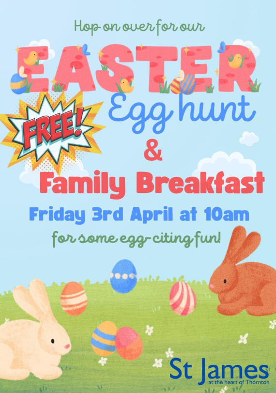 10am at St. James Church. Easter Egg hunt and free Family Breakfast – see poster.