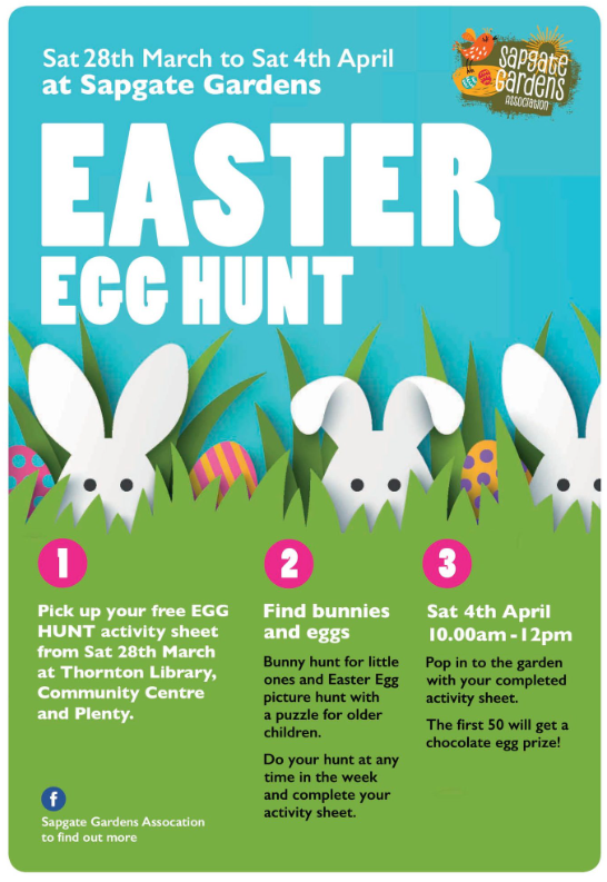 5pm to 7pm Sapgate Gardens’ Easter Egg Hunt, part 1. See poster