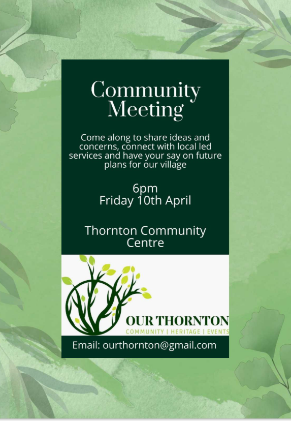 6pm at Thornton Community Centre, Community meeting – see poster