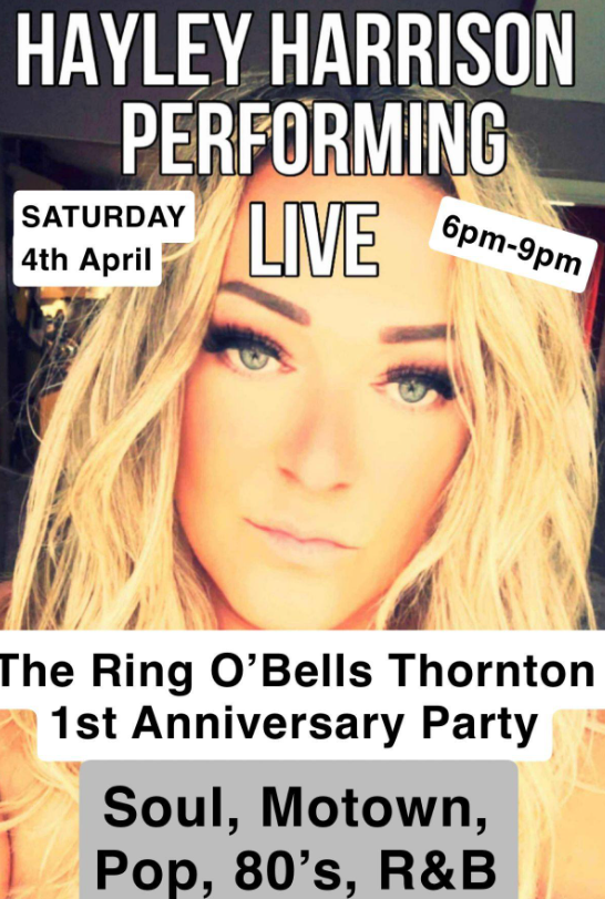 6pm to 9pm at the Ring o’ Bells, Hayley Harrison performing live – see poster