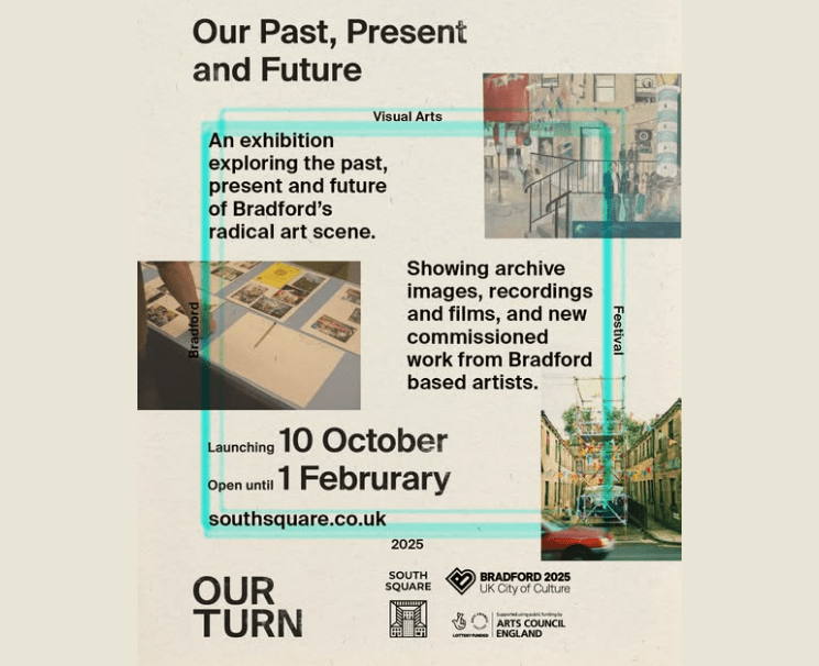 10 October to 1 February 2026 OUR TURN: Our Past, Present and Future’. “This exhibition explores the past of South Square and the history of the arts industry in Bradford, and how grassroots, DIY arts organisations led to the opening of the centre. This exhibition is part of OUR TURN which takes place between 26th September – 28th January 2026 in venues and unusual spaces across the city. This festival will enable artists to be more ambitious, provide training for a new generation of culture makers and inspire a range of people to be excited by art which is ‘Made IN Bradford’. The festival will celebrate Bradford’s rich counter cultural scene and create an accessible platform which will reach new art goers in Bradford, underserved communities and loyal arts audiences”