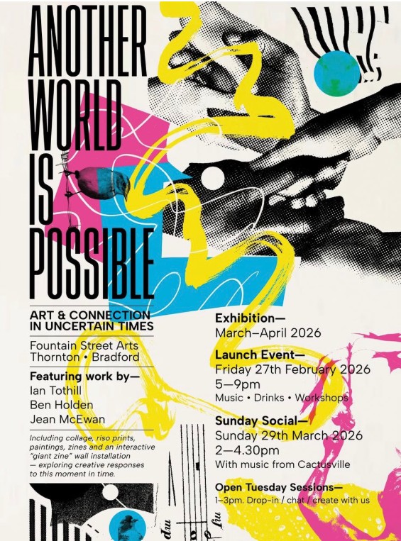 March to April Another World Is Possible Art and Connection in uncertain times. Launch event Friday 27 February 5pm to 9pm (Music, Drinks and Workshop). Sunday Social, 29 March, 2pm to 4.30pm with music from Cactusville