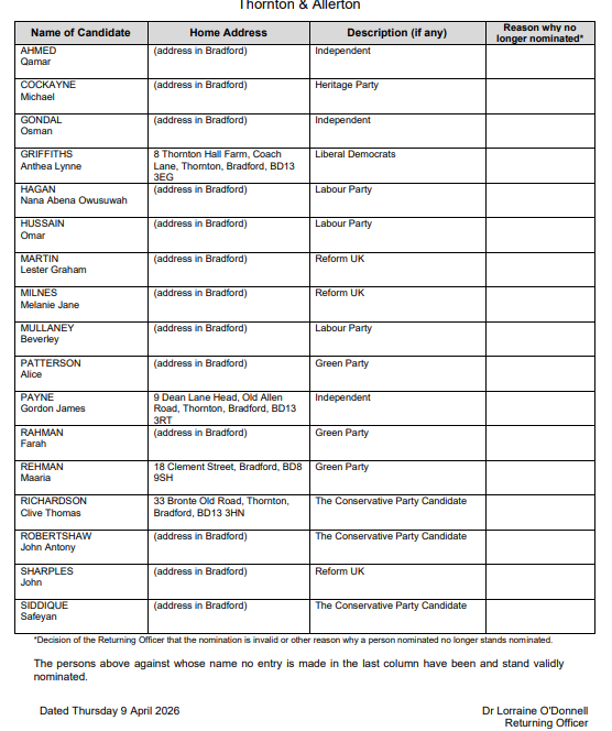 Thornton is part of Thornton and Allerton Ward which includes Sandy Lane. Due to boundary changes elsewhere in Bradford the election in 2026 will be for 3 councillors for each electoral ward. The candidates for this area in the elections to be held on 7 May 2026 are as follows: