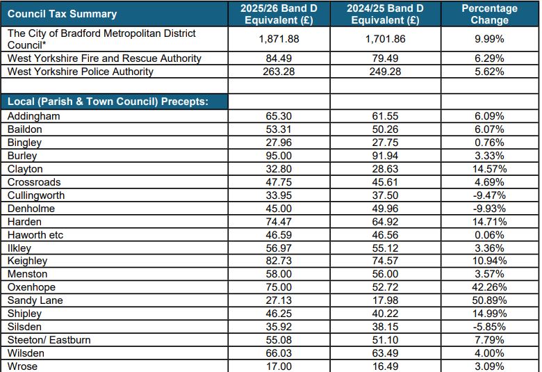 To work out the actual sum to be paid, each year, for the Parish Council, subtract the Bradford tax for your band from the total tax which includes your parish council, e.g a household in Council band C in Clayton, is being charged for their parish council £2,002.17 minus £1,973.00 = £29.17 for the year, for their parish council.