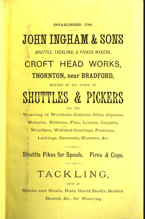 Ingham’s Shuttle Works, Market Street. John Ingham and Son’s works, called Croft Head Works, were roughly where Market Court and Thornton Library are now. An advertisement in the 1885 publication of “A practical treatise on weaving and designing of textile fabrics” states that the firm was established in 1796. The catalogue of the Royal Jubilees Exhibition of 1887 at Manchester includes “460a John Ingham and SonsCroft Head Works, Thornton, near Bradford. The firm also exhibited at London, Vienna and Paris. The firm ceased trading in the 1930s, and the works were demolished in the 1960s.