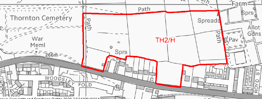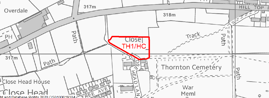 This area received planning permission for 11 dwellings, dated 13/7/17. The area originally formed the most northern part of a larger housing area, reference TH/002 Close Head. Land to the west of Thornton Cemetery in the former proposed Bradford Development Plan. The larger area, from Thornton Road near the bus turning circle to the dwellings at Close Head Lane, plus the TH1/HC site received planning permission in 2008, but hasn’t proceeded because of access issues at the Thornton Road end. The land, TH1/HC is owned by Bradford Council. (Updated 13 July 2025)
